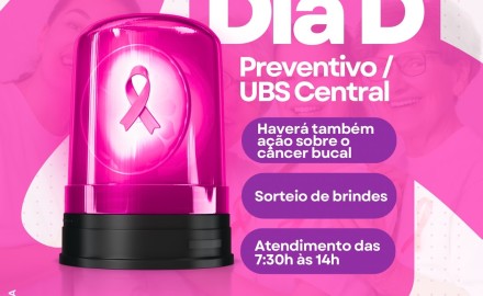 A Prefeitura Municipal, por meio da Secretaria de Saúde, convida todas as mulheres do município para participar do Dia D do Preventivo, que será realizado neste sábado, 25 de outubro, na UBS Central, das 7h30 às 14h.