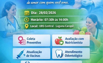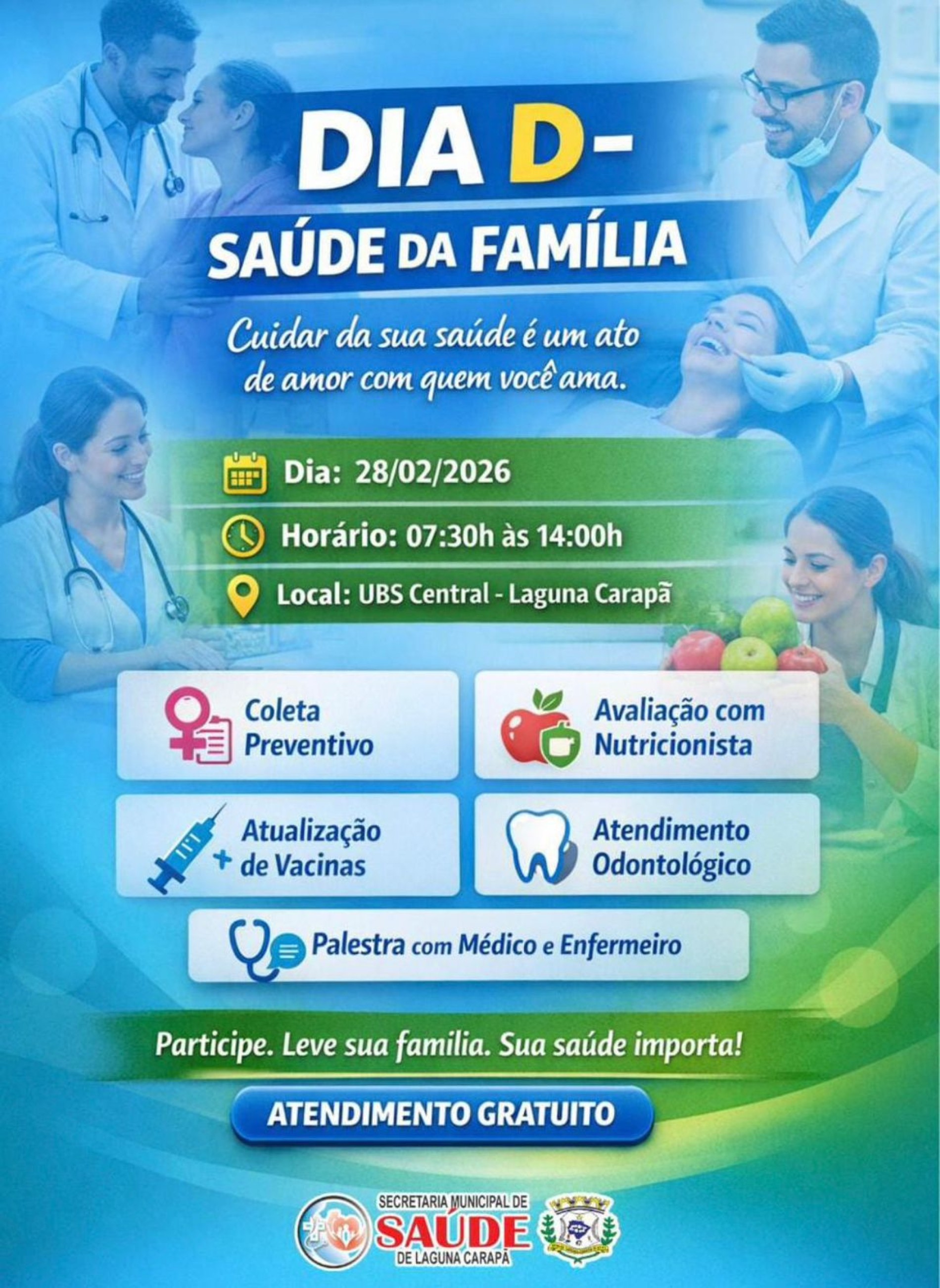 A Prefeitura Municipal de Laguna Carapã, através da Secretaria Municipal de Saúde, promove no sábado, 28 de fevereiro de 2026, o Dia D – Saúde da Família, uma ação especial voltada ao cuidado integral da população. O atendimento acontecerá na UBS Central, das 7h30 às 14h, oferecendo diversos serviços gratuitos à comunidade.