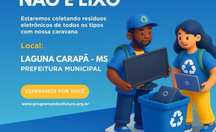 A Prefeitura Municipal de Laguna Carapã promove nesta segunda-feira, 06 de outubro, uma importante ação de sustentabilidade em parceria com a Caravana “Eletrônico Não é Lixo”. O evento acontece das 08h às 16h, em frente à Prefeitura Municipal, e tem como objetivo incentivar o descarte correto de resíduos eletrônicos, contribuindo para a preservação do meio ambiente e o reaproveitamento de materiais tecnológicos.