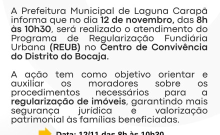 A Prefeitura Municipal de Laguna Carapã, por meio do Programa de Regularização Fundiária Urbana (REURB), promoverá um plantão de atendimento no Distrito do Bocaja, no próximo dia 12 de novembro, das 8h às 10h30, no Centro de Convivência da comunidade.