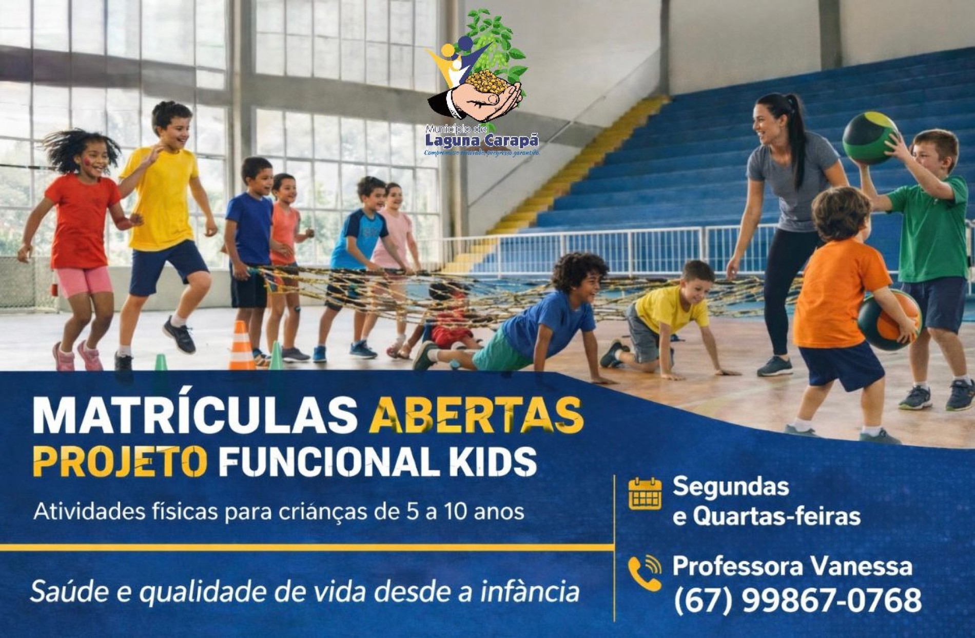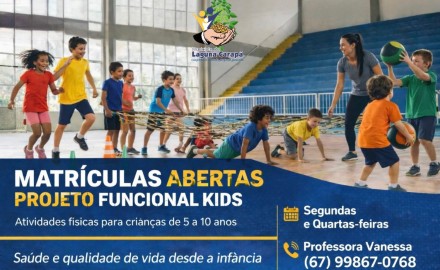 A Prefeitura Municipal, por meio da Secretaria Municipal de Esportes, informa que estão abertas as matrículas para o projeto Funcional Kids, iniciativa voltada a crianças de 5 a 10 anos, com foco na promoção da saúde física, no desenvolvimento motor e na formação de hábitos saudáveis, pensando em um futuro mais ativo e equilibrado.