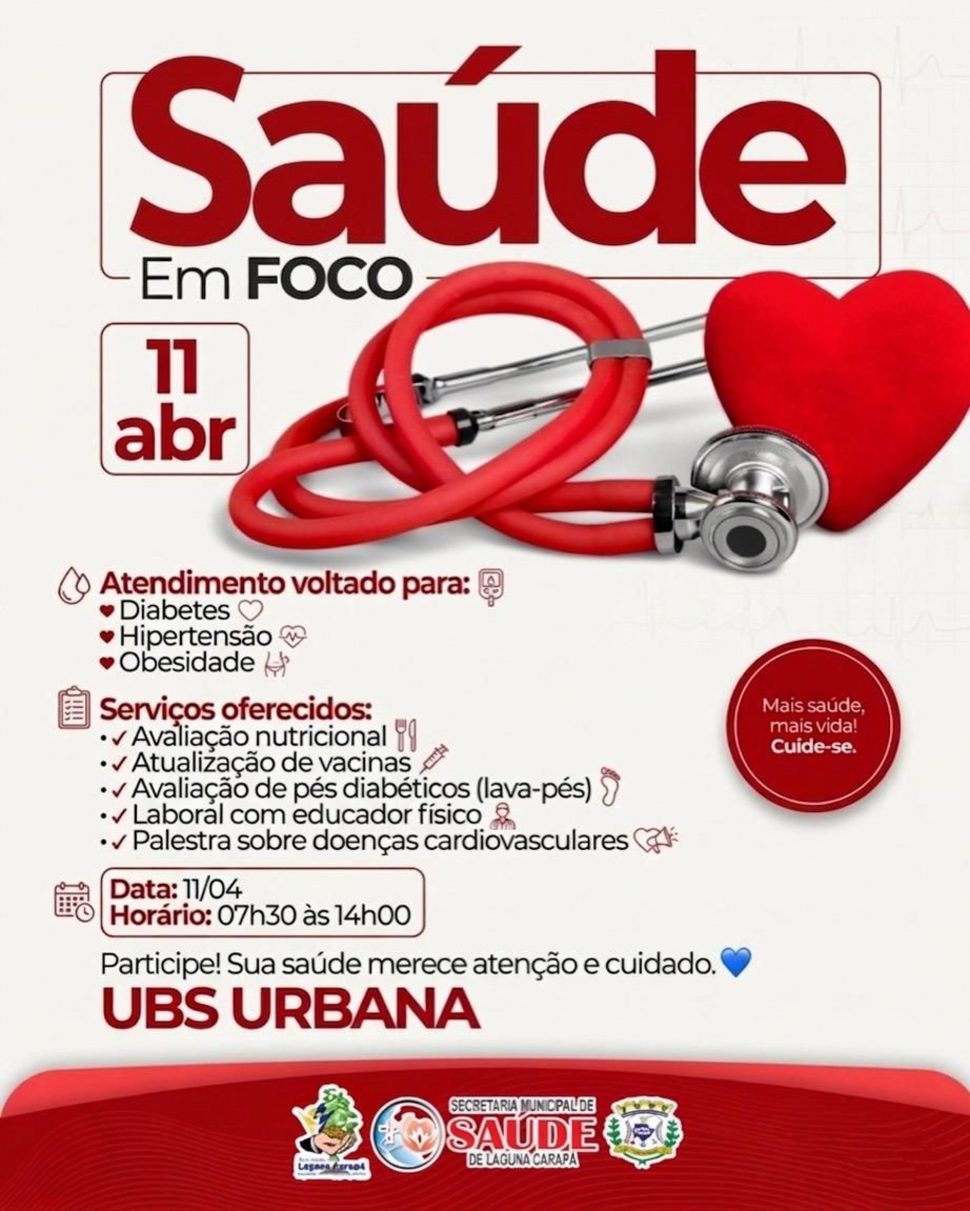 A Prefeitura Municipal de Laguna Carapã, por meio da Secretaria Municipal de Saúde, promove nesta sexta-feira, 11 de abril, a ação “Saúde em Foco”, na UBS Urbana, com uma programação especial voltada ao cuidado e à prevenção de doenças.