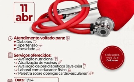 Durante a ação, serão oferecidos diversos serviços gratuitos, como avaliação nutricional, atualização da carteira de vacinação, avaliação de pés diabéticos (lava-pés), atividades laborais com educador físico e palestra educativa sobre doenças cardiovasculares.